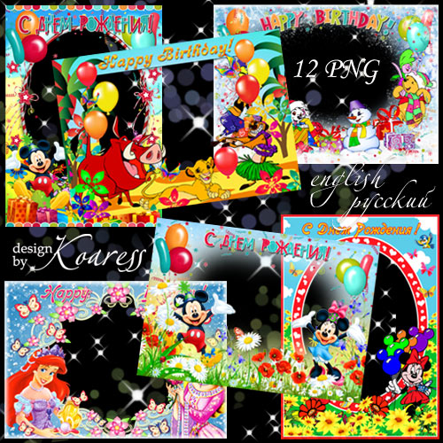 Набор поздравительных детских png фоторамок с персонажами мультфильмов - С Днем Рождения 12 PNG, русский и английский | 3508x4961 | 300 dpi | 167,36 Mb Автор: Koaress |