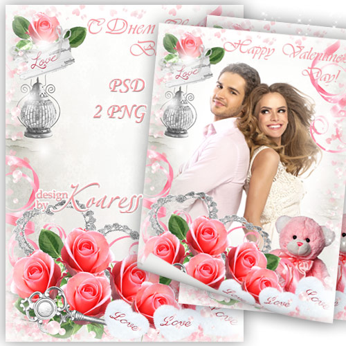 Рамка для фото к Дню святого Валентина с розовыми розами, сердечками, подарками PSD, многослойный, 2 PNG | 3508x4961 | 300 dpi | 142,23 Mb Автор: Koaress |