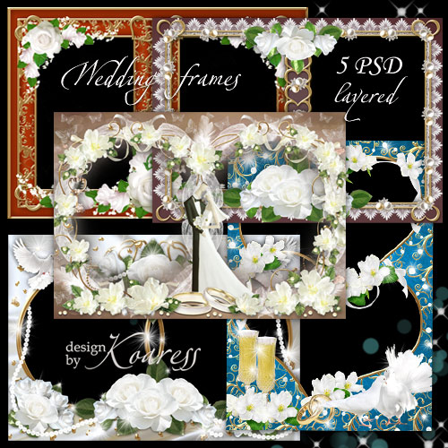 Набор из 5 многослойных свадебных рамок для двух фото - Два сердца бьются как одно 5 PSD, многослойные | 5332x3770 | 300 dpi | 274,45 Mb Автор: Koaress |
