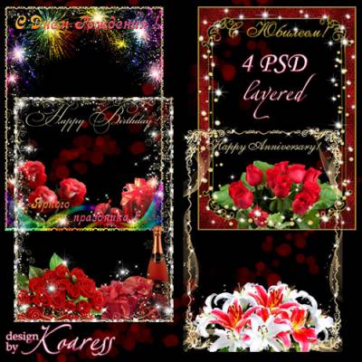 Набор из 4 поздравительных фоторамок с яркими цветами - С Днем Рождения, с Юбилеем 4 PSD, многослойные | 3770x5332 | 300 dpi | 187,58 Mb Автор: Koaress |