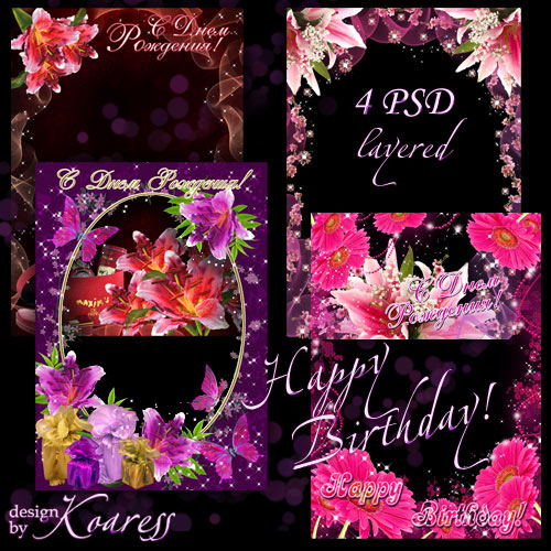 Набор из 4 поздравительных фоторамок - С Днем Рождения, с Днем Рождения 4 PSD, многослойные | 3770x5332 | 300 dpi | 251,77 Mb Автор: Koaress |