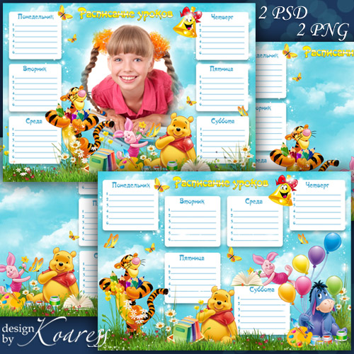 Расписание уроков c рамкой для фото с героями мультфильма Винни Пух - Мои чудесные друзья Два варианта расписания - с рамкой для фото и без 2 PSD, многослойные, 2 PNG | 4961x3508 | 300 dpi | 127,66 Mb Автор: Koaress |