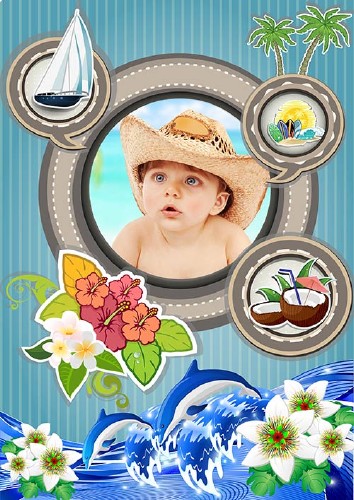 Морская детская рамка для фотошоп - морские волны дельфины пальмы кокосы всё есть у малыша PSD | 1 шт | 3520x4975 | 300 dpi | Слои раздельно | 73.73 MB Автор: soch |
