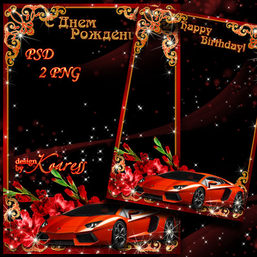 Поздравительная мужская рамка для фотошопа с цветами и спорткаром - С Днем Рождения PSD, многослойный, 2 PNG | 3508x4961 | 300 dpi | 58,4 Mb Автор: Koaress |
