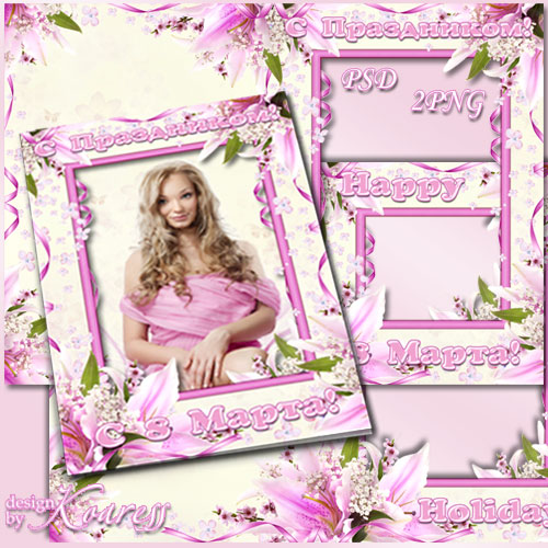 Поздравительная открытка с рамкой для фотошопа - С Днем 8 Марта, с Праздником Весны PSD, многослойный, 2 PNG | 4959x3543 | 300 dpi | 73,95 Mb Автор: Koaress |