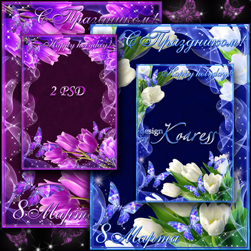 Две романтические фоторамки к 8 Марта - Белые и сиреневые тюльпаны и бабочки 2 PSD, многослойные | 3543x4959 | 300 dpi | 142,78 Mb Автор: Koaress |
