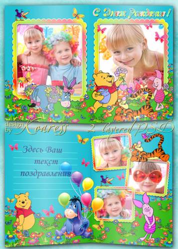 Детская двусторонняя поздравительная открытка с вырезами для фото - С Днем Рождения с персонажами мультфильма Винни Пух 2 PSD, многослойные, 3 PNG | 4961x3508 | 300 dpi | 132,76 Mb Автор: Koaress |