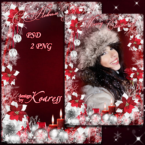 Праздничная новогодняя рамка для фотошопа - Красные цветы, серебристый снег PSD, 2 PNG | 3508x4961 | 300 dpi | 114,35 MB Автор: Koaress |