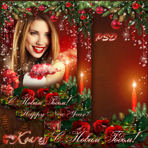 Романтическая зимняя рамка для фото - Розы, свечи и Новый год PSD | 3508x4961 | 300 dpi | 105,99 MB Автор: Koaress |